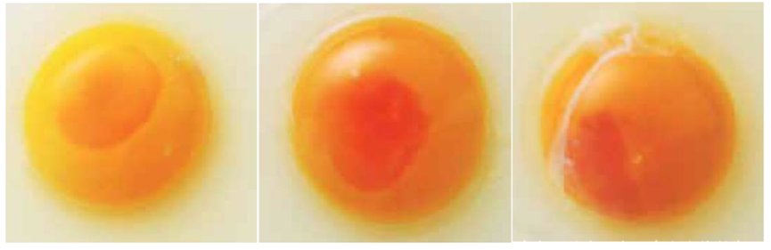 有研究發(fā)現(xiàn),有的蛋黃表面的顏色會發(fā)生局部變化,形成不同形狀大小的黃斑。據(jù)研究報道,至少有一半的蛋黃表面有一定大小的黃斑,這些是由于滲透壓的增加和卵黃膜的弱化從而導致水分從白蛋白遷移到蛋黃中。除了鈣缺乏,單寧酸和尼卡巴嗪(一種用于預防球蟲感染的藥物)誘發(fā)黃斑的可能性外,儲存過程中的振動也會影響黃斑的形成,并且更有可能出現(xiàn)當雞蛋在較高溫度下儲存時。這些斑點的存在不影響食用,但可能會降低雞蛋的商品價值。